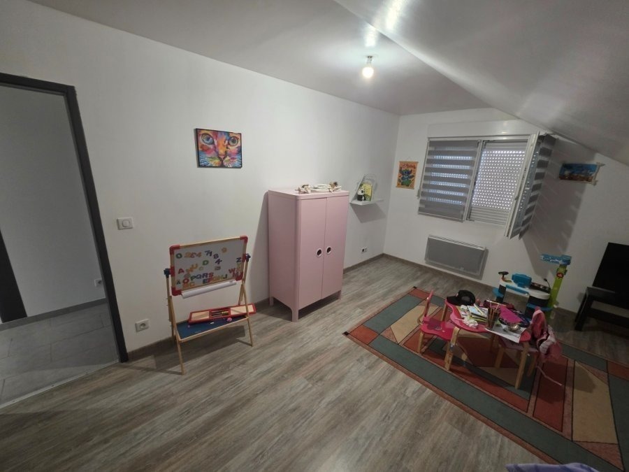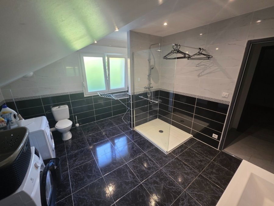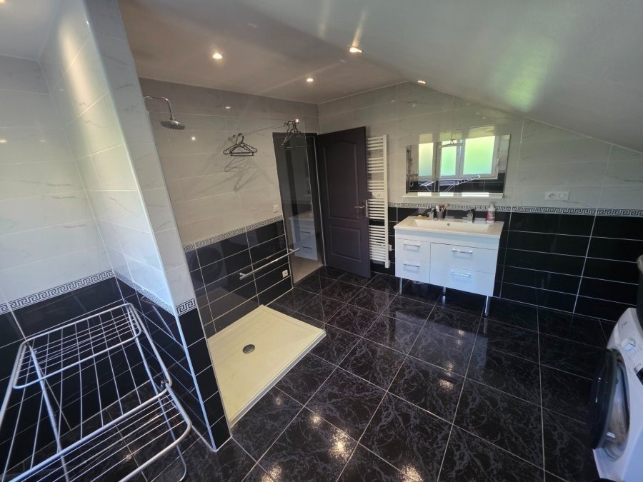 A l'étage un palier desservant 3 grandes chambres, une deuxième salle d'eau avec espace buanderie et WC.
