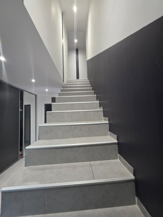 En rez-de-chaussée vous découvrirez une belle entrée spacieuse avec un très grand placard avec 4 portes coulissantes, un WC séparé avec lave-mains, une cuisine équipée ouverte sur salon/séjour avec accès terrasse, une suite parentale (douche et double vasques).