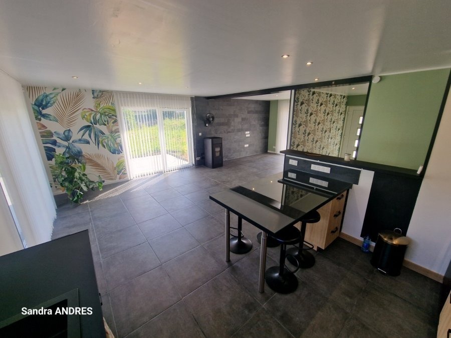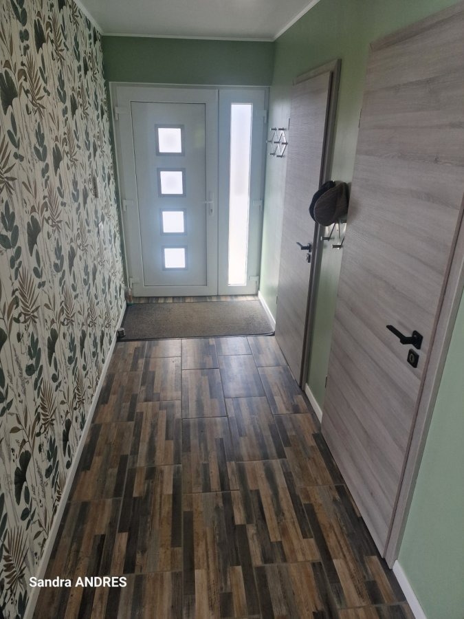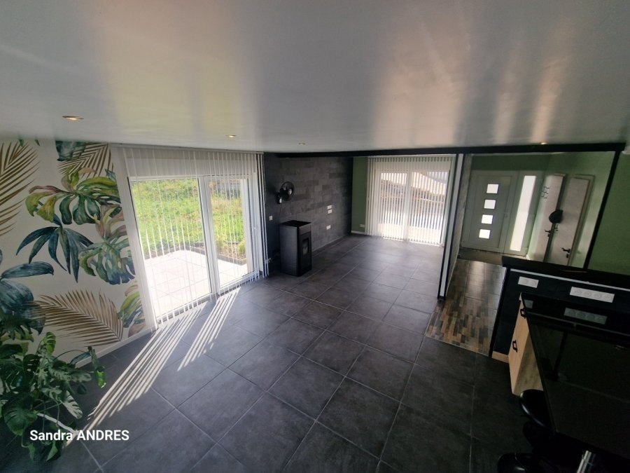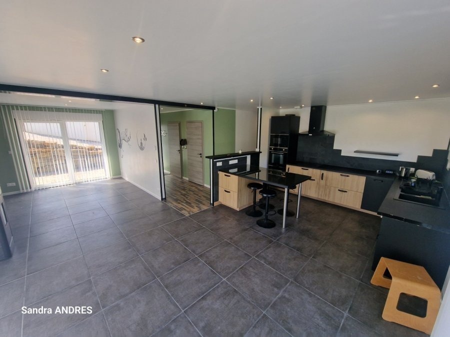 Entrée sur couloir desservant un WC séparé avec lave-mains, une pièce de vie d'environ 44 m² soit une cuisine équipée ouverte sur salon/séjour donnant accès sur l'extérieur par de grandes baies vitrées.