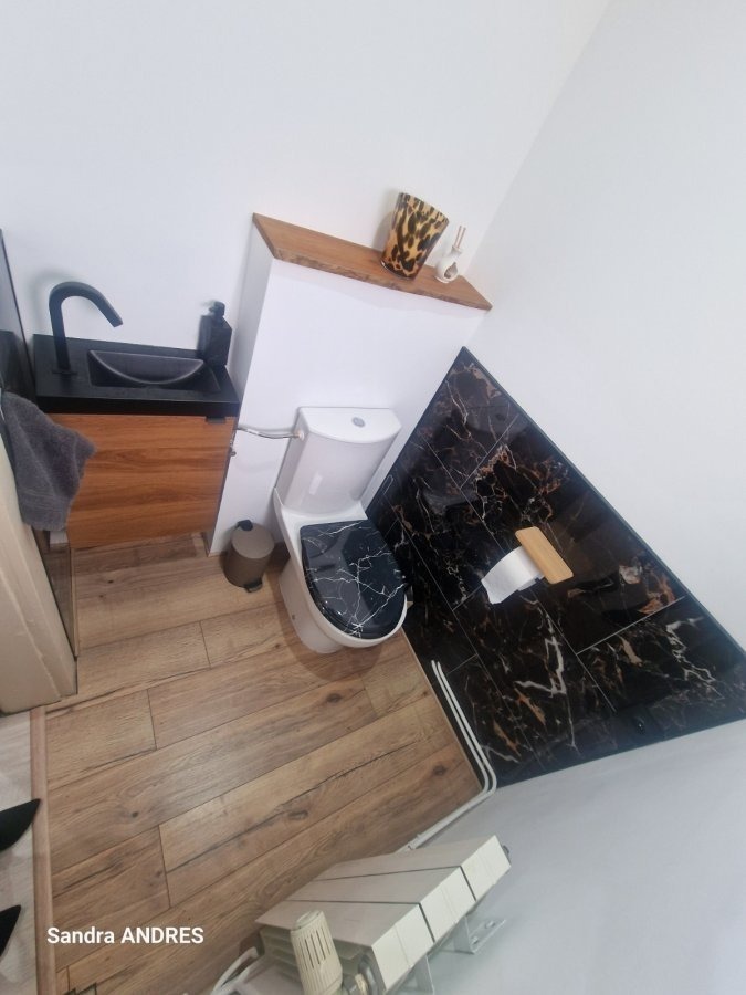 Egalement une première salle d'eau avec espace buanderie, un WC séparé avec lave-mains.